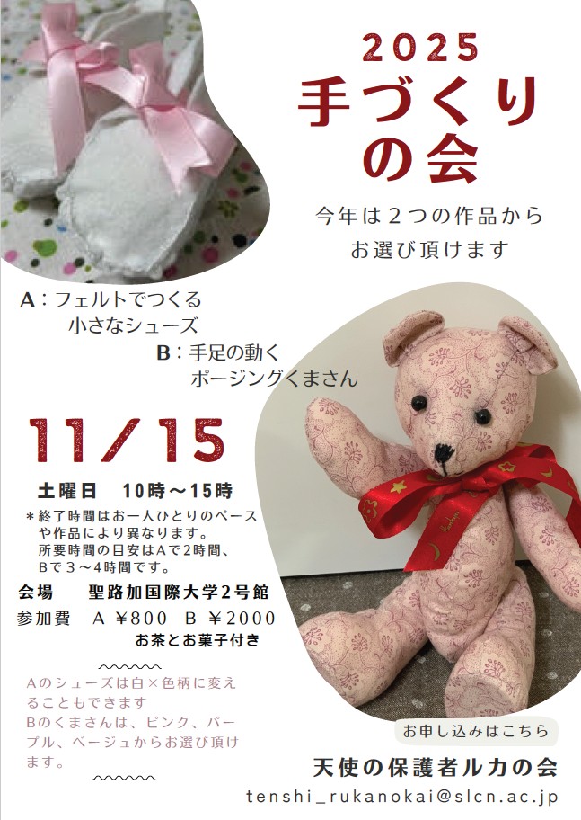 申込方法:天使の保護者ルカの会(tenshi_rukanokai@slcn.ac.jp)にメールでお申し込みください。その際、作るもの(A.フェルトで作る小さなシューズ、B.手足の動くポージングくまさん)と色など(添付のポスターをご覧ください。)を合わせてご連絡ください。